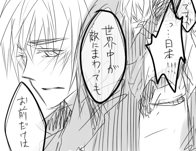 日本だけが自分の味方でいてくれれば、それで―…なイギリスさんがよいかと思われます。茜ちゃんはギャグじゃねぇか^^といいますが、私はいたってマジだと思いますよ!ええ!切ない恋は英日のジャスティス!